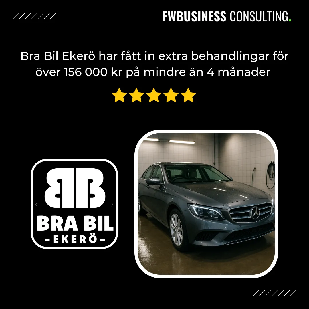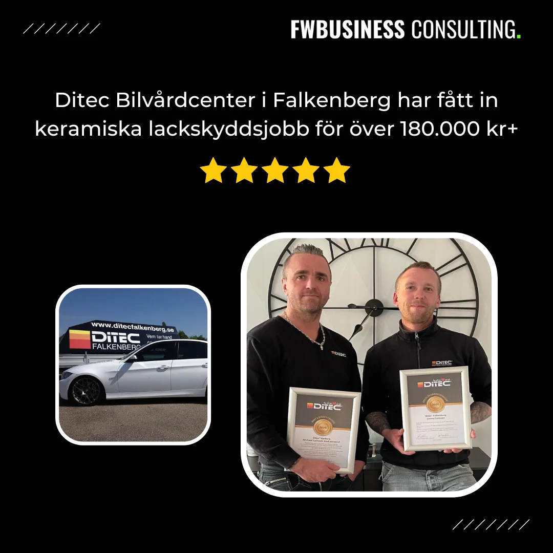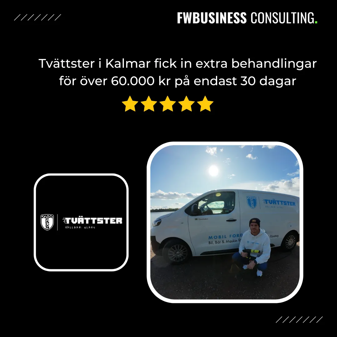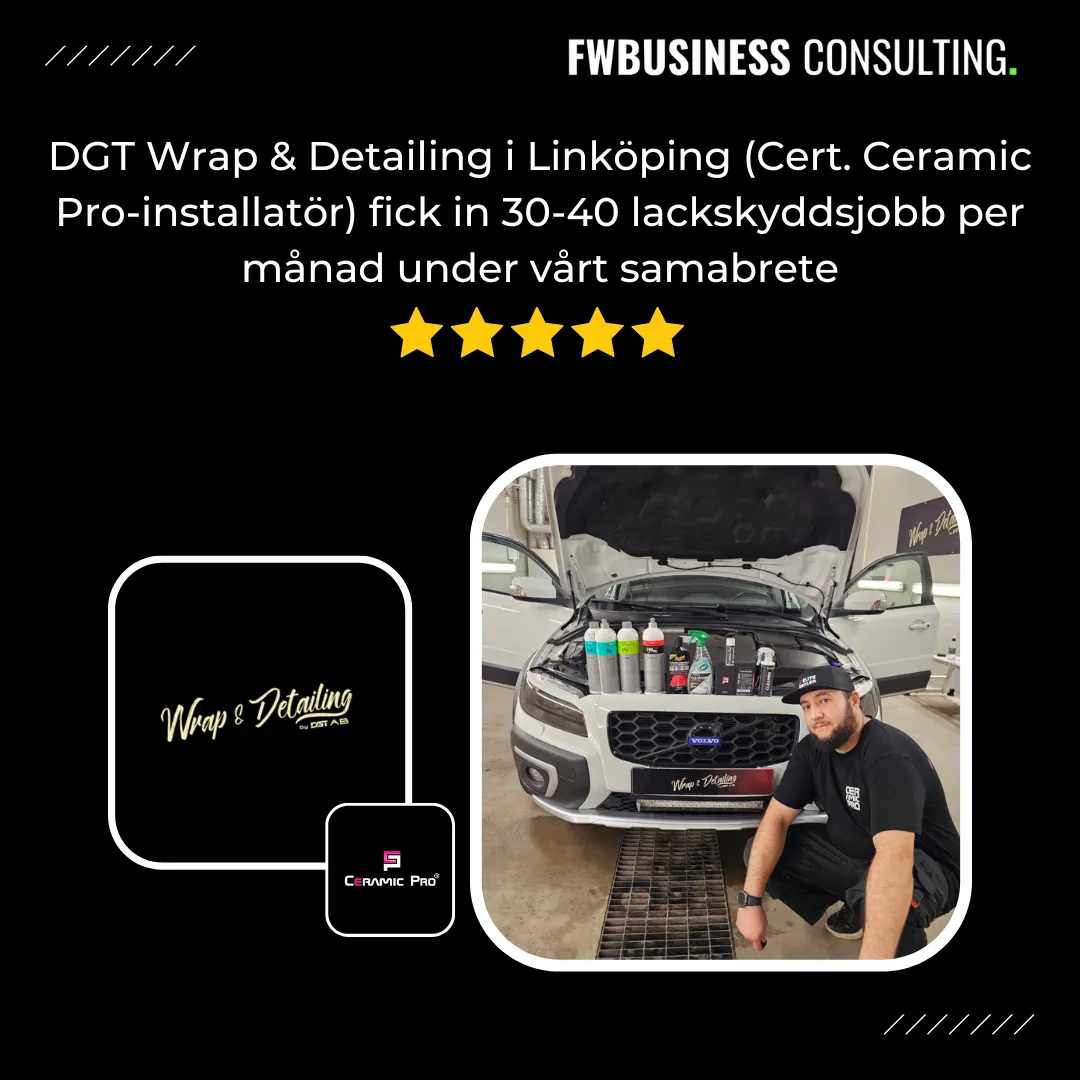 "Att arbeta med FW Business Consulting har verkligen varit en game-changer för oss på DGT Wrap & Detailing. Deras skräddarsydda lösningar och strategiska rådgivning har hjälpt oss att effektivisera vår verksamhet och locka fler kunder. Tack vare deras insatser har vi ökat våra lackskyddsjobb med 30-40 extra per månad. Jag är imponerad av deras professionalism och ser fram emot att fortsätta utveckla vår verksamhet tillsammans med deras hjälp."
