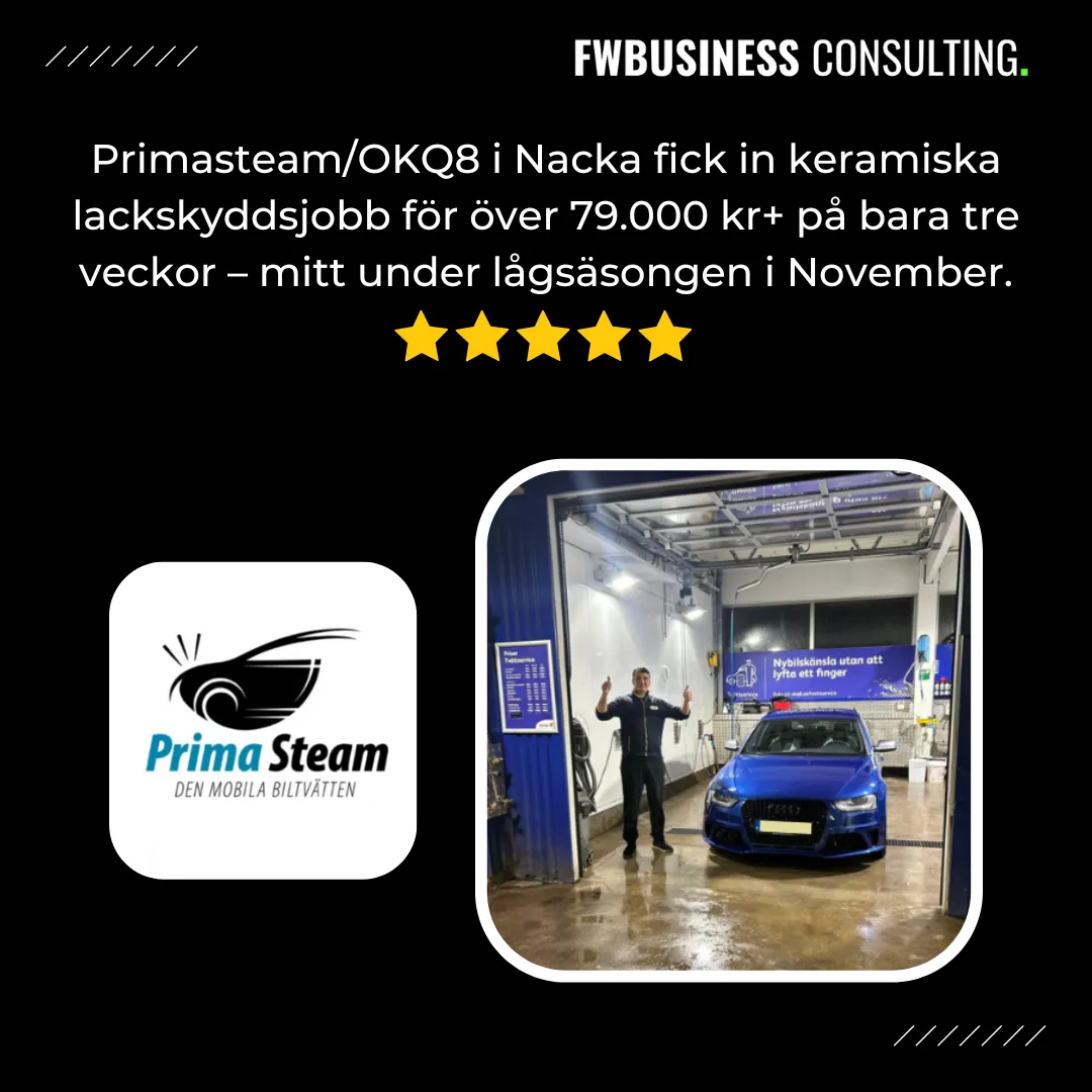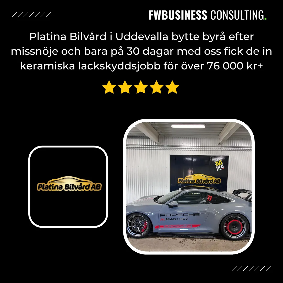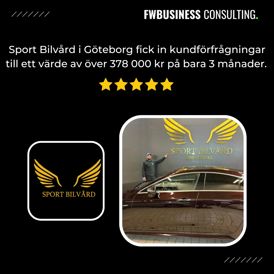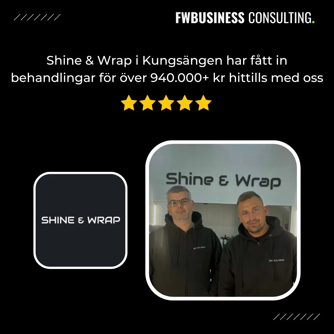 "Vi på Shine & Wrap har haft nöjet att arbeta med FW Business Consulting och deras expertis har verkligen gjort skillnad för oss. Genom deras strategiska rådgivning och affärsutvecklingstjänster har vi sett en märkbar ökning i våra PPF-installationer – hela 6 extra per månad. Deras skräddarsydda lösningar och insiktsfulla tillvägagångssätt har hjälpt oss att växa och optimera vår verksamhet. Vi är tacksamma för deras stöd och ser fram emot fortsatt framgång tillsammans."