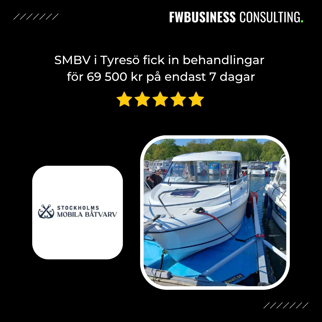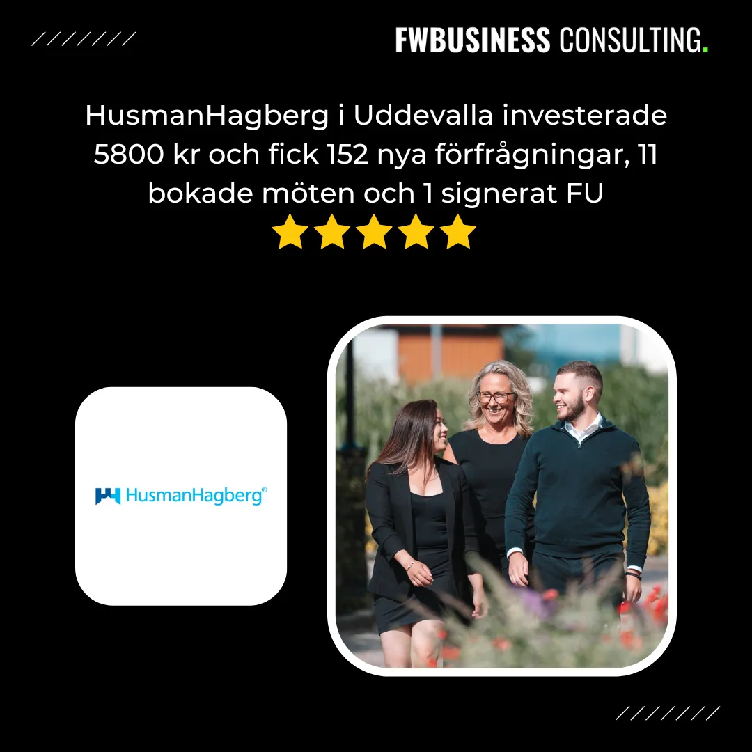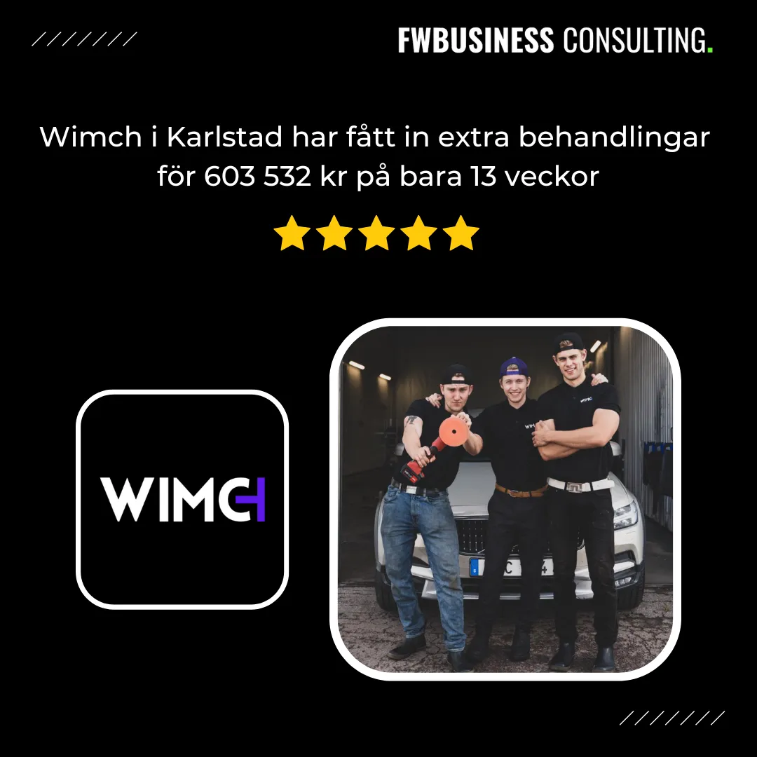 "Vi på Wimch har haft ett fantastiskt samarbete med FW Business Consulting. Deras expertis och strategiska rådgivning har lett till en enorm framgång för oss. På bara 45 dagar har vi fått 156 potentiella kunder och bokat behandlingar till ett värde av 177 000 kr. FW Business Consulting har verkligen hjälpt oss att öka vår synlighet och driva vårt företag framåt. Vi är otroligt tacksamma för deras insatser och ser fram emot att fortsätta växa med deras stöd."