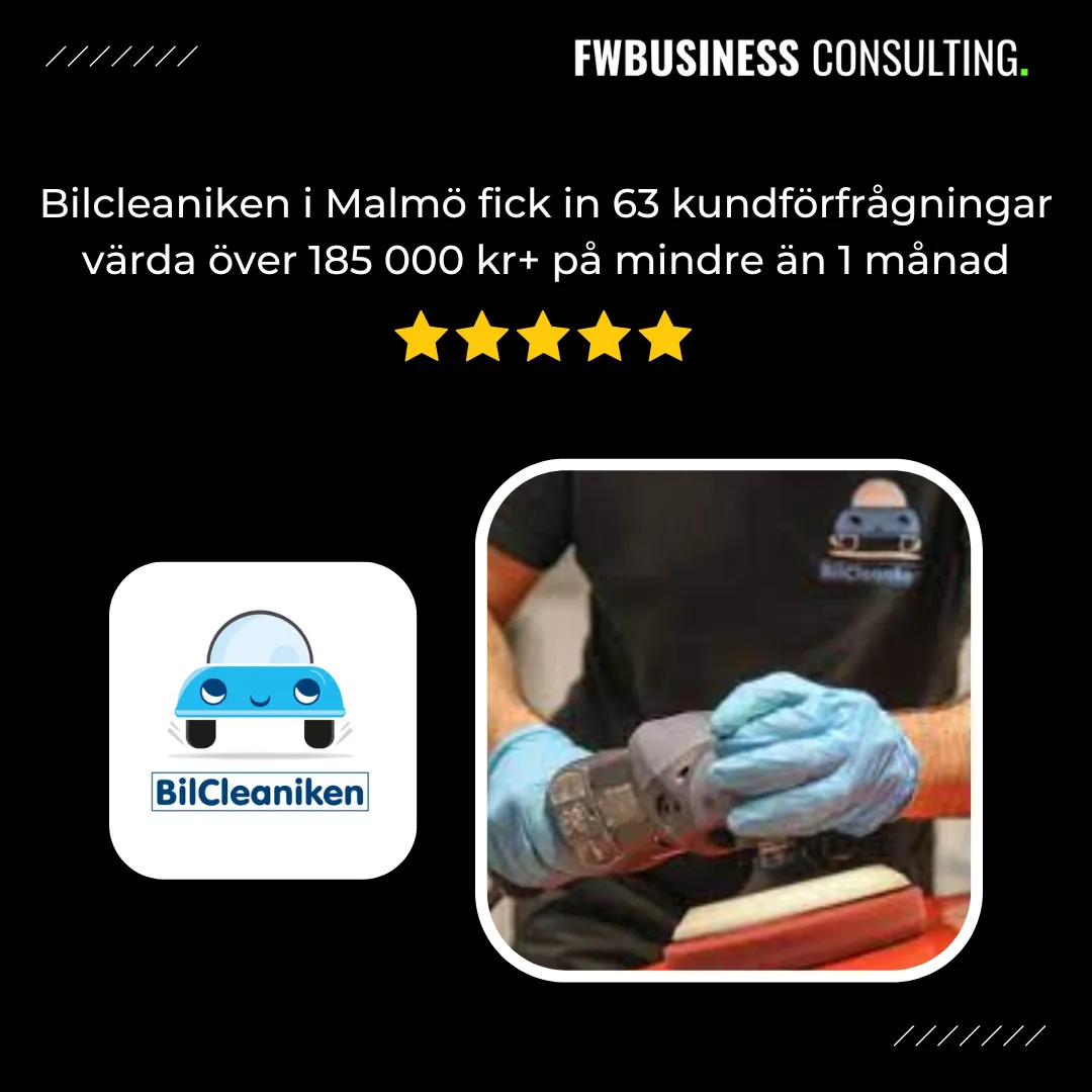 Vi erbjuder en komplett helhetslösning för bilvårdsfirmor i Sverige. Med vårt system kan du förvänta dig att få mellan 25-100+ nya kunder per månad, vilket hjälper dig att uppnå dina mål på ett effektivt och skalbart sätt.